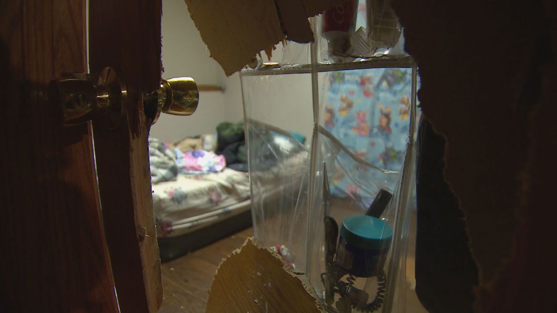 On Sunday, a large hole could be seen through the bedroom door. Sofia and other family members at the house said ICE agents detained both of the 7-year-olds’ parents and that his father has a work permit.ย